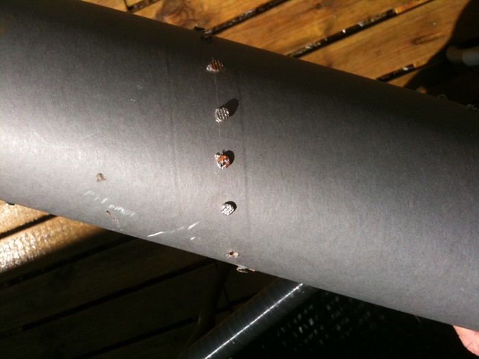 Utiliser une perceuse munie d’un foret fin (du diamètre des clous que vous utiliserez) et percer le tube en suivant la spirale descendante tracée à l’étape 1. (ou suivre la spirale imaginaire de l’étape 2) Laisser environ 1 cm entre chaque trou (1cm c’est juste pour te faire croire que c’est un tutoriel sérieux. Inutile de mesurer, hein. Evite juste d’espacer de trop)